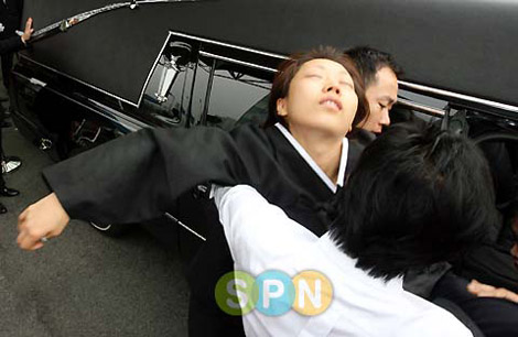 演員安在煥的出殯儀式于11日早晨8時在首爾江南圣母醫(yī)院殯儀館舉行,妻子鄭善姬再次暈倒,令現(xiàn)場人員難過萬分。(圖片來源:Edaily SPN)