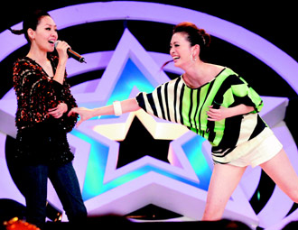 小S(左)頂班主持“星光大道”,評(píng)審劉真(右)想拉她一起秀舞蹈遭拒。