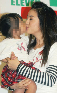 林依晨(右)昨天為關(guān)愛(ài)之家募款,親吻艾滋寶寶,希望大家別歧視艾滋病患。