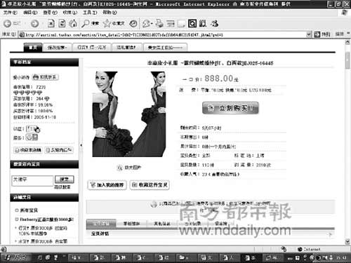 日前,記者在淘寶網(wǎng)上發(fā)現(xiàn)有店鋪“一口價(jià)888元”叫賣“”李嘉欣小禮服———露背蝴蝶婚紗“,并在頁面上打出廣告語稱”本店長久經(jīng)營上千款明星婚紗、晚裝禮服,并同多家藝人經(jīng)紀(jì)公司長期合作。“說得有模有樣,并將李嘉欣大婚身著該件紅色禮服的圖片放在頁首處,相當(dāng)顯眼。