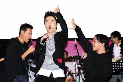 在昨日的發(fā)片會上,張學(xué)友和陳奕迅新老兩歌神不僅到場助陣,還帶來了庾澄慶最喜歡吃的巧克力和薯片,寓意他在香港“吃得開”。三人特別合唱了《愛你的只有一個我》、Rap版《愛是懷疑》以及搖滾版《吻別》。開唱前張學(xué)友打趣說:“情緒好點(diǎn)了嗎?”陳奕迅還特別提醒在座媒體“留心歌詞”。由于三人的表演非常精彩,有記者發(fā)問,庾澄慶是否考慮與張學(xué)友和陳奕迅組成一個類似“縱貫線”的樂隊(duì),庾澄慶說:“你剛才看到的表演我們才排練了十分鐘,每一次他們都覺得哪里加一個和音會比較有亮點(diǎn),在他們百忙之下一共合作了三次。我覺得我們?nèi)齻首先應(yīng)該有作品,因?yàn)閷W(xué)友馬上就有專輯出來,Eason也正在錄音,把三個人放在一起表演有困難,如何協(xié)調(diào)才是真的,所以先有歌會比較好。我們?nèi)齻中,學(xué)友比較煽情,我比較搖滾,陳奕迅的發(fā)揮很即興,寫這首歌的人不一定是我,但是寫的人一定會很過癮。如果市場反應(yīng)不錯的話,可以跟‘貫縱線’拼一下!