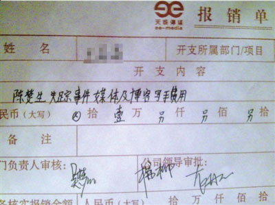 這份報銷單中,開支內容一欄寫的是“陳楚生失蹤事件媒體及博客寫手費用”,部門負責人審核一欄簽有天娛傳媒宣傳總監(jiān)吳夢知的名字,公司領導審批則有天娛總經(jīng)理龍丹妮和天娛副總楊柳的簽名。