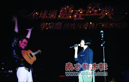 張艾嘉的出現(xiàn)令觀眾極為興奮。這個(gè)被李宗盛稱為“大姐”的女人一上臺(tái)就調(diào)侃李宗盛:“在歌壇里,小李是我的最愛,那你的最愛是誰?”讓李宗盛無言以對(duì)。她唱起了《我這樣愛你到底對(duì)不對(duì)》、《因?yàn)榧拍罚不忘輕松地在舞臺(tái)上表現(xiàn)兩個(gè)人的友情:“你們看過小李演的電影沒有?他演的多數(shù)是喜劇,悲劇也能演成喜劇,每次都演我的丈夫或者男朋友,唉,我真的很不幸……”此外她還逼問:“你的歌都很浪漫,不知道你是不是一個(gè)浪漫的男人?”李宗盛據(jù)實(shí)以答:“把渴望而不可得的寫入歌中,我的實(shí)際人生很沉悶的。”張艾嘉最后很奔放地勸說他:“再找個(gè)好點(diǎn)的,再生個(gè)妞。”記者 齊帥 攝影 馬強(qiáng)