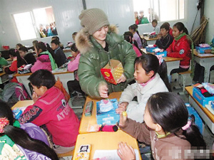 昨日,成都《新潮生活周刊》以《死于硬盤 生于硬盤》為題曝光了一批鐘欣桐(阿嬌)年前往北川賑災的圖片,記錄了她探訪重災區(qū)北川的鄉(xiāng)村小學的全過程。該小學的校長透露,阿嬌的和藹可親得到了孩子們認可,其中一張圖片里,阿嬌還親切地給一個婦女背上的女孩子喂桔子。據(jù)采寫該報道的記者透露,這組照片其實是得自一個遺落在當?shù)鼐瓢傻挠脖P。
