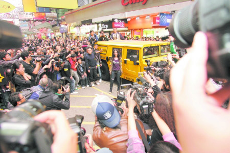 三月十一日,藝人不雅照女主角之一的鐘欣桐(阿嬌)復(fù)出后首次現(xiàn)身香港鬧市街頭,引來數(shù)百人圍觀,爭相拍攝。阿嬌復(fù)出后首份工作是擔(dān)任一個牛仔褲品牌的代言人,當(dāng)日出席該品牌一分店的宣傳活動。 中新社發(fā) 黎金良 攝