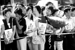隨著時(shí)間的推移,氣溫逐漸升高,炎炎烈日卻擋不住東大廳外聚集越來越多的人群,記者看到央視主持人朱迅來到后費(fèi)了好大力氣才進(jìn)入大廳,而維持治安的民警向記者表示,大致估計(jì)到場群眾有8900人。羅京生前的同事趙忠祥、邢質(zhì)斌、崔永元、李詠、宋世雄等都來送別,朱軍更是失聲痛哭。據(jù)央視臺辦工作人員表示,當(dāng)央視除了必須在崗值班的人員外,幾乎都來到八寶山做最后告別。北京電視臺的主持人聶一菁等也來送別央視的老大哥。