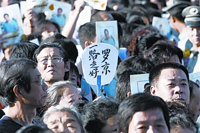 清晨開始,來(lái)自各方的群眾自發(fā)前往八寶山悼念羅京,長(zhǎng)達(dá)百米的隊(duì)伍蜿蜒而至公墓大門之外,數(shù)百只花圈擺滿靈堂兩側(cè),寄托著各方人士對(duì)羅京的緬懷之情。有白發(fā)蒼蒼步履蹣跚的80歲老人,有在父母帶領(lǐng)下、牙牙學(xué)語(yǔ)的孩子,有從小與羅京一起學(xué)習(xí)的同學(xué),有羅京高中母校的代表,有曾經(jīng)受過他指導(dǎo)的實(shí)習(xí)生,還有專程從美國(guó)趕來(lái)送羅京最后一程的校友,很多人憶起與羅京生前的點(diǎn)滴黯然淚下。近萬(wàn)人的哀悼隊(duì)伍井然有序,大家手持白菊,每七人一組向羅京遺體三鞠躬,為“國(guó)嘴”祈禱送行。