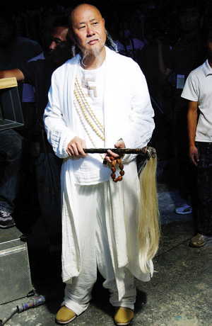 造型:一身白袍,加上白頭發(fā)白胡子,再掛一串菩提子,這個(gè)意境十足的裝扮只需花五分鐘———此乃現(xiàn)場(chǎng)記者親自驗(yàn)證。劉鎮(zhèn)偉為人寬容,記者湊著他猛拍也不介意,還叫化妝師把簾子拉開(kāi),別把大家熱壞了。