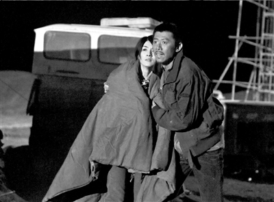 前晚,《西風(fēng)烈》在祁連山腳下的一個礦石場拍攝夜戲。從敦煌市區(qū)到拍攝地,一路荒漠。在深夜接近零度的氣溫下,高群書執(zhí)導(dǎo)拍攝了一場吳鎮(zhèn)宇焚燒押解警察和亡命鴛鴦所在的帳篷,想把他們?nèi)繜赖膽蚍荨?