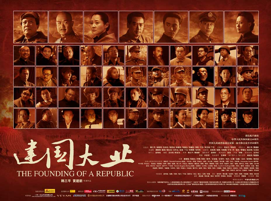 中新網(wǎng)9月4日電 國(guó)慶獻(xiàn)禮大片《建國(guó)大業(yè)》的最新四款海報(bào)日前公開(kāi)。廣州日?qǐng)?bào)報(bào)道說(shuō),《建國(guó)大業(yè)》共有172位明星加盟,平均每3分鐘就能看到一張熟悉的明星臉,其中大部分都是露一露臉就走的“龍?zhí)住薄?bào)道質(zhì)疑,這么多明星參與完成的一部電影,可能是“群英薈萃”,也可能變成“蘿卜開(kāi)會(huì)”。