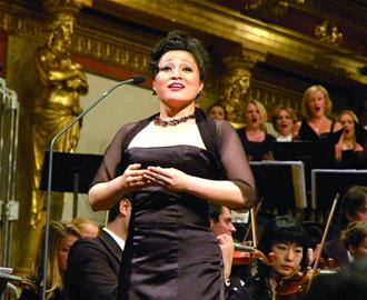 15日在維也納金色大廳舉行的首屆全球華人新春音樂(lè)會(huì)上,美籍華人女高音歌唱家黃英在演唱。當(dāng)晚,100多名藝術(shù)家在這里用音樂(lè)這一世界性語(yǔ)言詮釋了復(fù)興中的中華民族和諧、發(fā)展與振興的時(shí)代強(qiáng)音。