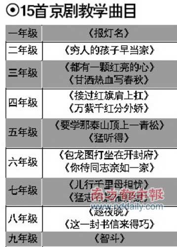 昨日廣東省教育廳體育衛(wèi)生與藝術(shù)教育處副處長何志強告訴記者,他剛剛看到了教育部的文件。要求是每省選擇一個重點市開展試點,每省選20所學校,分別是10所小學和10所初中,在音樂課程中增加京劇曲目教學。教育部要求從2008年3月到2009年7月在北京、天津、黑龍江、上海、江蘇、浙江、江西、湖北、廣東、甘肅等10省市開展試點工作,并在試點的基礎(chǔ)上逐步在全國推開。