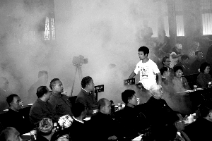 11時許,委員們攜手走進了基地內(nèi)仿制的“中南海懷仁堂”,這里的道具都是模仿當年的真實場景設(shè)置,包括桌上的水杯、文件封面。邁進“會場”,大家表情嚴肅了許多,已連續(xù)3屆當選政協(xié)委員的徐定茂回憶,自己第一次走進人民大會堂履職時,心情也非常激動,“第一屆會議具有特殊意義,可想當年委員們的心情。”在導(dǎo)演的指揮下,委員們落座,投入“默哀”、“選舉”等場景的拍攝中。記者傅沙沙