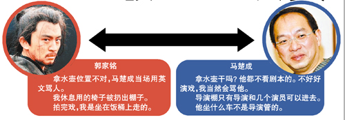 馬楚成說:“我對郭家銘是有意見。我是很少罵人的導演,為什么我罵了他?為什么片場的化妝、梳頭這些工作人員都不喜歡他?我覺得他應該檢討一下自己。他的戲演得不好,我讓他演一場醉酒的戲,開拍之前他喝了很多酒,正式拍的時候他竟然醉到了沒法拍的地步,要第二天重拍。他們那邊又說第二天不行,他要去云南拍一個電視劇。我很生氣,因為他們進組前告訴我說已經(jīng)推掉了云南那個戲,怎么能刻意騙人呢?搞得我們的戲卡在那里。再說他拿著水壺的那場戲,他都不看劇本的,大家都沒水喝了,他拿那么大壺水干嗎?自己不好好演戲,我當然會罵他啦。我讓他演戲不要那么夸張,他不聽,當自己大牌,那我就只好刪他的戲了。他還不斷地問我為什么不拍他的特寫,這部戲叫做《花木蘭》哦,每個群眾演員、每個小角色都給很多特寫,這戲還怎么演?”