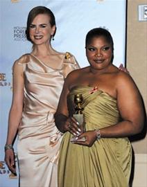 雖然妮可·基德曼近年來屢屢被冠以“票房毒藥”的惡名,但她從來都是各大頒獎禮上的耀眼之星。妮可穿了一身單肩小花白色長裙,左胸下有發(fā)散出來的垂褶。她是頒獎禮上第一個上臺頒獎的嘉賓。雖然妮可的白色單肩禮裙很美,但她一上臺就為自己沒穿黑色裙裝向海地地震的死難者默哀表示歉意,并且宣傳了網(wǎng)絡(luò)捐款渠道和喬治·克魯尼最近發(fā)起的捐款行動。