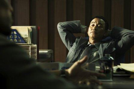 在扣人心弦的音樂聲中,從任達(dá)華關(guān)鎖的雙眉間,似乎可以竊看到剛剛被升為槍擊案專案調(diào)查組組長孫局長內(nèi)心的矛盾和掙扎。這場戲恰如其分地表達(dá)了刑警角色此時此刻矛盾人生的徘徊心情,導(dǎo)演十分滿意。(麥田)