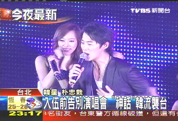 據(jù)臺(tái)灣TVBS報(bào)道,樸忠栽用中文對(duì)歌迷喊出:“我愛你!”他當(dāng)兵前在臺(tái)灣的最后一次演唱會(huì),可以說是卯足了勁,就怕一當(dāng)兵會(huì)被歌迷遺忘。