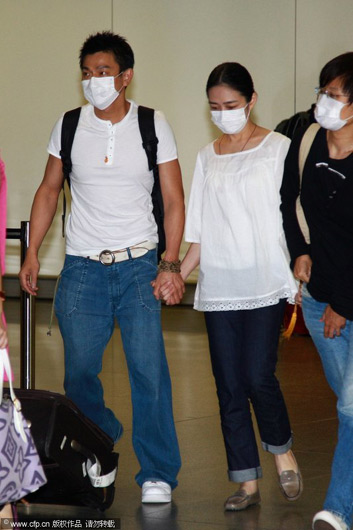 劉德華和朱麗倩兩人一樣身穿白色上衣和藍(lán)色褲子戴著口罩,身上并掛著朱家兒女在朱父出殯時(shí)的佛珠項(xiàng)煉,十指緊扣步入機(jī)場(chǎng)登機(jī)門。