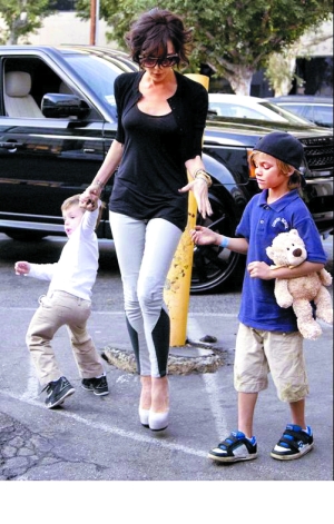 上周五,剛從倫敦返回洛杉磯的貝嫂就化身“慈母”,帶著4歲的克魯茲和7歲的羅密歐,前往好萊塢北部一家著名的酸奶屋買冰激凌。不過貝嫂這次一改往日的精致妝容和得體衣著,梳著有些凌亂的頭發(fā),穿著最低調(diào)的簡約款黑色上衣和灰色細腿褲,領著兩個孩子在街上走。如果脫掉腳下那雙具有貝嫂招牌裝扮的、大于10厘米的高跟鞋的話,維多利亞也不過是個清瘦一點的家庭婦女罷了。