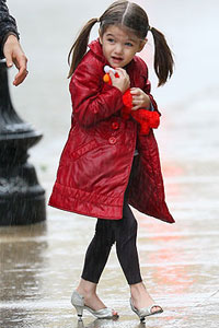 凱蒂•赫爾姆斯(Katie Holmes)與蘇瑞(Suri Cruise)11月份到波士頓陪湯姆克魯斯(Tom Cruise)時,被媒體拍到她帶著小蘇瑞逛街血拼。3歲的蘇瑞雖然手里抱著洋娃娃,但腳踩銀灰色高跟鞋,一副早熟的“小大人”模樣。