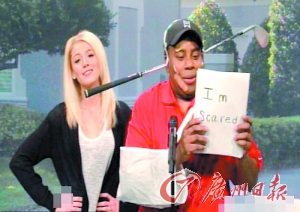 在一則小品中,布雷克裝扮成“虎嫂”艾琳,逼著搭檔基南·湯普森扮演的伍茲公開(kāi)道歉,后者拿著印有“老婆太厲害了,我錯(cuò)了,我害怕極了”之類字眼的紙板不停道歉,令人忍俊不禁。