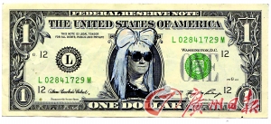 Lady gaga可謂紅得發(fā)紫,日前,美國畫家克里斯·格里森將印有美國第1任總統(tǒng)喬治·華盛頓頭像的1美元鈔票,篡改成Lady gaga的經(jīng)典造型。