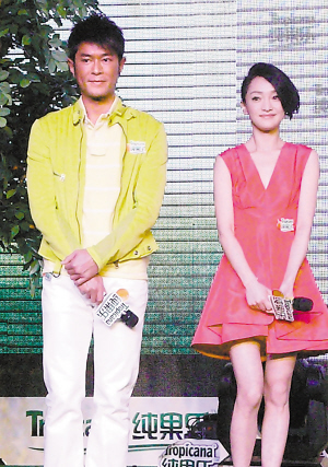 昨天在北京三里屯Village舉行的活動(dòng)中,除了周、古兩人亮相外,正在成都籌備個(gè)唱的許巍也發(fā)來(lái)VIDEO,演唱了他為純果樂(lè)打造的主題曲《晨星》。為配合品牌的多彩顏色,古天樂(lè)和周迅分別以翠綠休閑裝和橙色短裙亮相,他倆一上臺(tái)就隔得遠(yuǎn)遠(yuǎn)的,在回答各自對(duì)對(duì)方的感覺(jué)時(shí),古天樂(lè)很無(wú)厘頭地贊周迅“是個(gè)好人”,“她很年輕”,周迅則稱古仔“很幽默”。在主持人的帶領(lǐng)下,兩人回憶了各自的童年趣聞和從藝經(jīng)歷,可惜兩位代言人卻始終沒(méi)有交流。