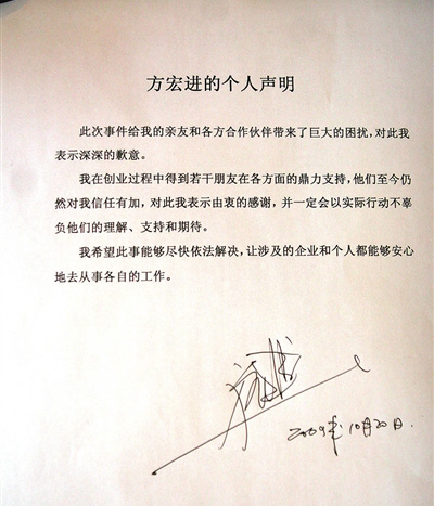 方宏進(jìn)的聲明字?jǐn)?shù)并不多,全文為打印字體,在文末空白處,方宏進(jìn)簽上了自己的名字。一開(kāi)頭,方宏進(jìn)就道歉,“此次事件給我的親友和各方合作伙伴帶來(lái)了巨大的困擾,對(duì)此我表示深深的歉意!憋柺軤(zhēng)議的方宏進(jìn)直言:“希望此事能夠盡快依法解決,讓涉及的企業(yè)和個(gè)人都能夠安心地從事各自的工作!