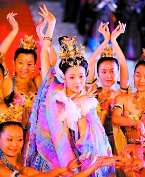 在《楊貴妃秘史》的拍攝基地,記者們首次看到了該劇剛剛制作完成的40分鐘片段。在片花中,演員們華麗的服飾十分搶眼,“霓裳羽衣舞”也得到了完整展示,尤小剛表示,片中的舞蹈段落非常多,全劇拍攝的4個月中,舞蹈團隊就跟了三個半月,“大家都以為拍古裝戲,打仗的場面最難拍,其實不然。拍攝這部劇最難的是在復原很多鮮為人知的唐朝文化細節(jié)。觀眾在這部劇中可以看到數(shù)百人組成的唐代宮廷樂隊,黃秋生扮演的李隆基也表演了好幾段舞蹈!