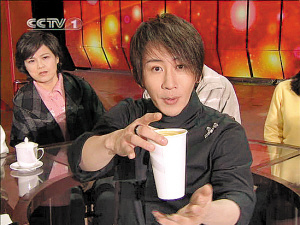 1.劉謙的魔術(shù)臺邊,赫然立著一桶某品牌的果汁。