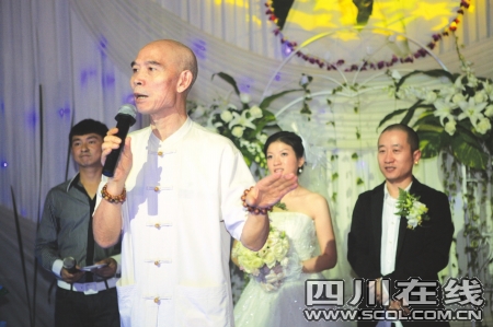 12點09分,婚禮正式開始,巴蜀笑星叮當(dāng)和朱軍聯(lián)袂主持。在6個“花仙子”的迎接下,李彧挽著陳燕琳,踏上紅色地毯,整個婚禮過程與傳統(tǒng)婚禮并沒有太大差別。叮當(dāng)宣布:“有請李伯清主婚登臺!”臺下300人立即爆出掌聲一片。李伯清登臺,依舊是他那詼諧、幽默的風(fēng)格,面對觀眾妙語如珠,他說:“之所以由我主婚,是因為李保田幾年前在成都拍攝《王保長新篇》,他用了我的許多學(xué)生,演了很多角色。還教育我的學(xué)生怎樣做人。今天他兒子娶了四川姑娘,這就是說,李保田一家人,看得起我們四川人!”李伯清主婚,不改插科打諢的特長。宣稱自己就是李彧和陳燕琳的父母,將來有什么事找他就是了,引來現(xiàn)場笑聲不斷。