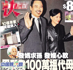 昨日有香港媒體報(bào)道,年屆九旬的發(fā)媽陳麗芳希望發(fā)哥能夠找代孕,為周家添后,一圓20多年的夙愿,同時(shí)也為周潤發(fā)10億元的家產(chǎn)“制造”繼承人。據(jù)知,有人提出以一百萬元代價(jià),在內(nèi)地尋覓優(yōu)質(zhì)代母,務(wù)求一擊即中。