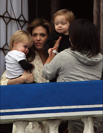 安吉麗娜·朱莉當(dāng)?shù)貢r(shí)間3月26日在位于威尼斯住所的陽臺(tái)上抱著龍鳳胎女兒Vivienne、兒子Knox觀賞美景。就在前一天,朱莉曾抱著女兒Vivienne在陽臺(tái)上親吻玩樂,而把兒子放在房內(nèi)隔窗而望。此次,身穿白色睡袍的朱莉睡眼朦朧,像是剛睡醒的樣子,她一人抱兩個(gè),生怕被說偏心,然而她卻明顯很吃力,抱了一會(huì)便不得不讓保姆出來幫忙。