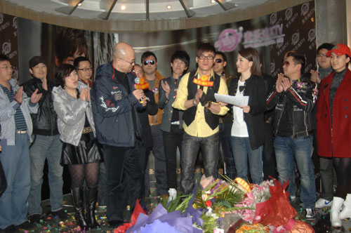 作為黃勇這張全新專輯的監(jiān)制,同時(shí)也是黃勇老板兼大哥的齊秦因?yàn)榕R時(shí)有事沒能來到發(fā)布會(huì)現(xiàn)場(chǎng),但通過VCR送上了他特別的祝福。齊秦對(duì)黃勇音樂給予了極大的肯定和祝福。黃勇的好友龐龍、尹相杰、熊天平等也通過VCR送上了祝福。北京圣天驕影視文化藝術(shù)有限公司老總李繼宏也送上了一份精心準(zhǔn)備的寓意深刻的禮物——金話筒,希望黃勇把他的歌聲通過這只金話筒帶給全世界所有喜歡他音樂的朋友。(李學(xué)仕)