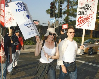 中新網(wǎng)11月7日電 美國編劇協(xié)會發(fā)動大罷工,好萊塢影視圈都受沖擊,電視尤其災情慘重,包括“迷失”、“反恐24小時”等,新一季拍攝進度整個被打亂,劉玉玲新戲“Cashmere Mafia”更從原定本月底在美首播,變得上檔遙遙無期。而“犯罪現(xiàn)場調查”女主角馬格·海根伯格與艾美獎影后、《俏媽新上路》主演茱莉亞·劉易斯·德瑞菲斯,現(xiàn)身聲援編劇,跟著他們高舉抗議牌。