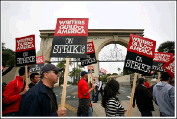 說起來讓人難以置信,罷工的起因是由于稿酬和版稅,而焦點卻在區(qū)區(qū)四美分。根據(jù)報道,編劇們要求在原先售出每張碟片可獲四美分版稅的基礎(chǔ)上,再加四美分。但這個小小的要求居然被“電影暨電視制作人聯(lián)盟”否決了。當(dāng)然編劇們還有一些其他的要求。最后談判破裂,導(dǎo)致罷工開始,劇作家們走上街頭。