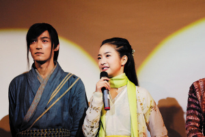 當(dāng)天記者會原本在露天場地舉行,但因為下雨的關(guān)系,工作人員即用帆布蓋頂,可是帆布卻負(fù)荷不了以致雨水傾盆而下,差點水淹現(xiàn)場。其他人看到水柱砸下,頂多“哇”一聲,胡歌卻搞笑的伸出兩個手指,大叫一聲:“雙龍戲水!”之后他的耍寶表現(xiàn)更多了。當(dāng)“黃蓉”林依晨中規(guī)中矩的評價“黃老邪”黃秋生:“他節(jié)奏感很強……”胡歌就會雙眼一瞪搶著爆料:“他(黃秋生)在現(xiàn)場的時候可能說了,不過只對他‘女兒’,閑下來還經(jīng)?妓龤v史地理知識,如果她回答不上來黃秋生就會笑話她,不過他只對‘女兒’親近,在戲外對我這個‘女婿’還是很看不起,哈哈!”“據(jù)說黃秋生一個人的片酬比你們幾個人的都高,你們有沒有什么想法?”又是胡歌搶著答:“是比我們加起來都高吧?哈哈,他資歷深,演技好,物有所值吧!”旁邊的“楊康”袁弘提醒他:“是人有所值!”胡歌趕快改口:“對,是人有所值!我們是物美價廉,哈哈!”