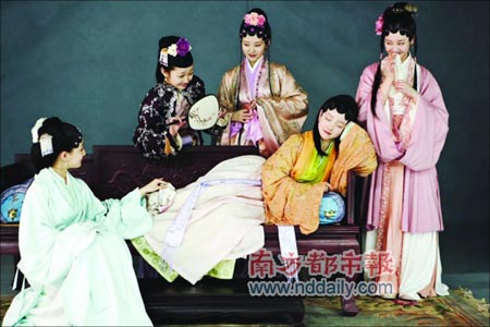 小寶琴(左一)、小湘云(橫臥者)、香菱跟姐妹們在一起。