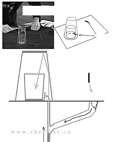 網(wǎng)友分析:在這個(gè)魔術(shù)中,我們可以注意到,大杯與小杯中間仍有縫隙,大杯是倒著放的,小杯則是正立著套在大杯里的。黑色的桌布主要是為了掩飾從桌下彈射硬幣的出口。在表演時(shí),劉謙攥著硬幣的手曾一直放在桌子的左下角,其實(shí)那里正是硬幣進(jìn)入的地方。經(jīng)過(guò)桌下的機(jī)關(guān),硬幣順勢(shì)滑到杯子下方。觀眾們看到的是硬幣從小杯子與大杯子間的桌面射進(jìn)大杯然后被大杯壁和大杯底2次反彈后落入小杯中的。經(jīng)推斷,劉謙應(yīng)該還在桌子某個(gè)位置布置了一個(gè)彈射硬幣的機(jī)關(guān),從而讓硬幣從桌布下面射出來(lái)。