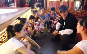 趙本山在二樓一直觀察排練,表情嚴(yán)肅。下樓后徑直走到臺前,把8位女孩叫到身邊!岸啻罅?”本山大叔態(tài)度和藹,先和她們嘮起了家常。