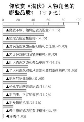觀眾欣賞《潛伏》中人物的哪些品質?調查中81.6%的人首推“處變不驚、隨機應變的智慧”,54.2%的人選擇“堅定的信念和信仰”,43.6%的人選擇了“對民族國家命運的擔當和責任感”,接下來依次為:“為了理想的自我犧牲精神”(38.8%),“用人管理之道和辦公室哲學”(36.3%),“個人利益絕對服從集體利益的奉獻精神”(32.9%),“絕對的紀律意識”(32.0%),“坐懷不亂的高尚品德”(31.4%),“對自由、正義的追求”(31.0%),“對愛情的執(zhí)著”(24.9%),“做生意的誠信和專業(yè)精神”(13.7%)。