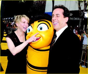 10月28日晚,洛杉磯西木區(qū)的曼恩鄉(xiāng)村劇院成為“蜜蜂”的世界,一輛輛漆成黃底黑條的甲殼蟲(chóng)汽車停在劇院外,走下車的是好萊塢女星蕾妮•齊薇格和喜劇明星杰瑞•宋飛,在同樣黃黑相間的地毯另一端,一只巨型大蜜蜂卡通玩偶早已恭候多時(shí),動(dòng)畫(huà)新片《蜜蜂總動(dòng)員》首映就這樣熱鬧登場(chǎng)了。