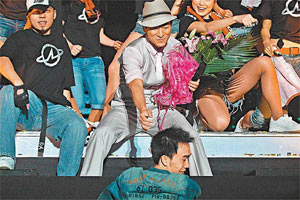 片段一開(kāi)始就見(jiàn)華仔在臺(tái)邊唱歌,其間一位男歌迷沖破兩道圍欄,趨近臺(tái)前送花。華仔邊唱邊笑著彎下身子,跟對(duì)方握手,并接過(guò)他的花。