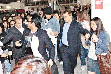 據(jù)香港太陽報(bào)報(bào)道,前晚十時(shí)半許,頭戴毛線帽的Rain背著LV袋,在數(shù)名工作人員的陪同下,現(xiàn)身香港機(jī)場(chǎng),引來近百Fans送機(jī),F(xiàn)場(chǎng)雖沒有保安員,但Fans為免耽誤他的時(shí)間,非常有秩序地為他開路。