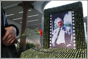 早上8點(diǎn),記者沿著長(zhǎng)長(zhǎng)的樓梯走上殯儀館新落成的悼念大廳,便看到孫道臨的一張巨幅彩色照片,身穿西裝的他站立風(fēng)中,風(fēng)流倜儻。照片做成了一幀膠片的樣子,以此紀(jì)念孫道臨近60年的電影人生。照片周圍則用白色玫瑰做成“相框”和底座,肅穆而不失溫暖。照片旁邊的大屏幕上滾動(dòng)播放《渡江偵察記》《早春二月》《不夜城》《雷雨》《非常大總統(tǒng)》《哈姆雷特》等孫道臨表演、導(dǎo)演、配音代表作的電影片段,以及孫道臨主持上海國(guó)際電影節(jié)、進(jìn)行朗誦表演的影像資料,從年輕到年老,從黑白到彩色,孫道臨幾十年的電影人生再次回放。