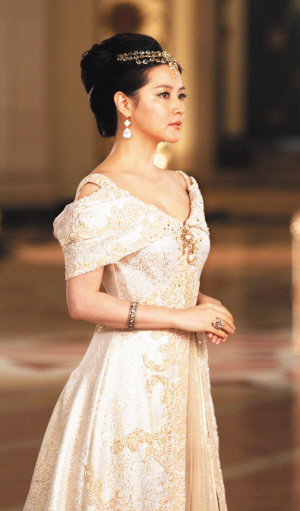 憑《大長今》風(fēng)靡全亞洲的韓國女星李英愛,前日現(xiàn)身上海展覽館為韓國某化妝品牌拍攝廣告。展覽中心被巧妙布置成具有歐洲風(fēng)格的皇宮,李英愛在低溫天氣下以一襲性感高貴的金色拖地長裙出現(xiàn),高聳的發(fā)髻上佩帶著華麗的鉆飾,顯得分外雍容華貴。