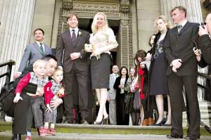 肖恩·賓原訂上個月與女演員蘇克利夫結(jié)婚,但在婚禮前24小時臨時取消,蘇克利夫當時說,是個人因素取消婚禮。昨日在倫敦市中心舉行公證結(jié)婚前,應邀的十多位至親好友一度擔心他們可能會再變卦,直到新人都出現(xiàn)才松了一口氣。