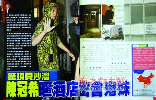 周刊還爆出,一直有吸煙習(xí)慣的陳冠希住在酒店吸煙層9樓,而且他已經(jīng)與酒店達(dá)成協(xié)議,一旦有需要,可利用酒店的特殊通道出入。