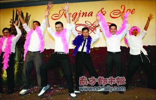 而新郎馬偉豪為了這場婚禮花了不少心思,除了以電影的形式記錄戀愛過程外,還瞞著新娘專門和兄弟們排演了一場“艷舞”在婚宴上表演,就為給新娘一個大大的驚喜?粗靶●R哥”在臺上扭腰挺胯搔首弄姿做出一個個“嫵媚”的姿勢,新娘和嘉賓都笑得前仰后合。這場婚宴從晚上6點半一直持續(xù)到深夜近12點,賓主才盡興而歸。