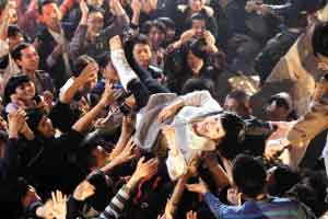 當(dāng)中拍攝一場(chǎng)搖滾音樂(lè)會(huì),為配合劇情需要,周迅穿上白色長(zhǎng)毛衣露面,不過(guò)右腿卻打上石膏,原來(lái)這是導(dǎo)演的安排。但現(xiàn)場(chǎng)有人誤以為周迅真的受了傷,引起一陣恐慌。拍攝時(shí)現(xiàn)場(chǎng)500名臨時(shí)演員更起哄將周迅抬起,像人肉輸送帶般送她上臺(tái),事后周迅大叫過(guò)癮,說(shuō)過(guò)程有如眾星拱月,令自己有女王般的感覺(jué),還笑言有機(jī)會(huì)的話,希望模仿外國(guó)搖滾歌手般“跳水”,跳到臺(tái)下讓觀眾接住自己。